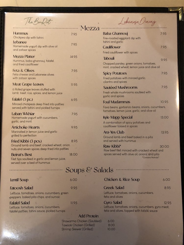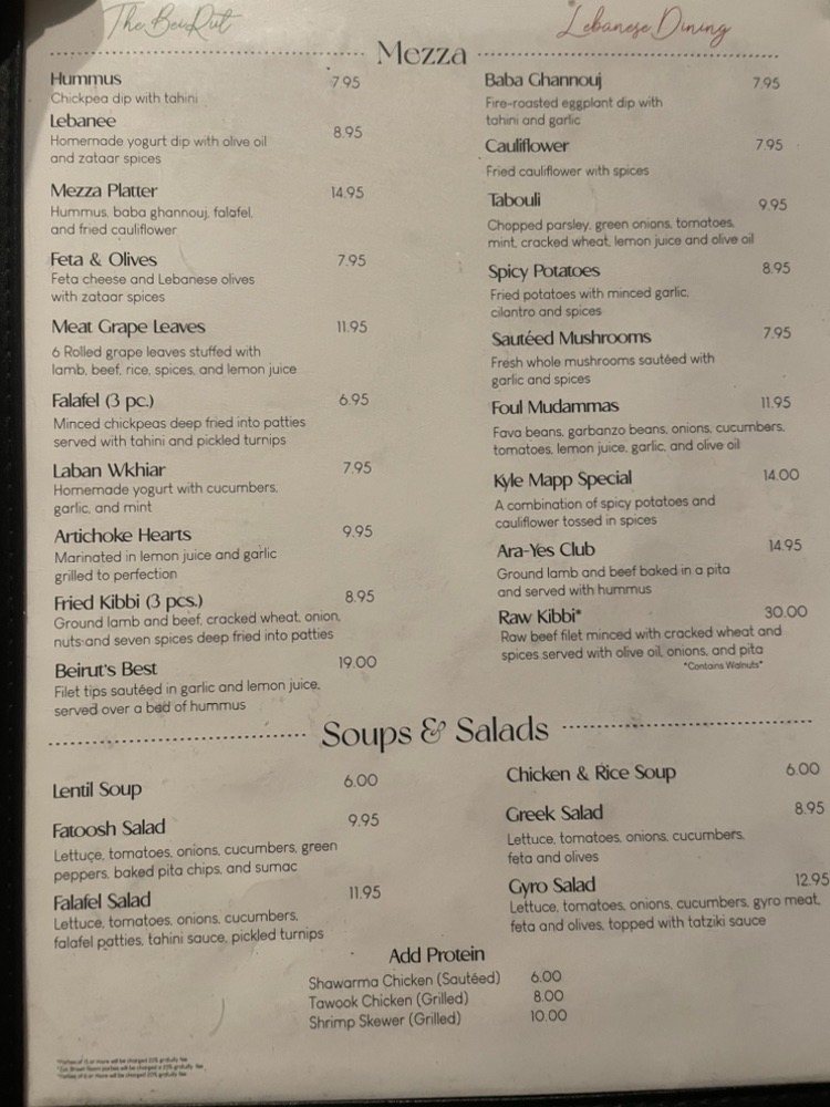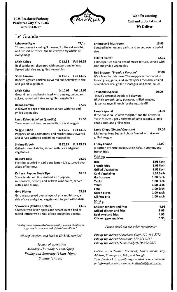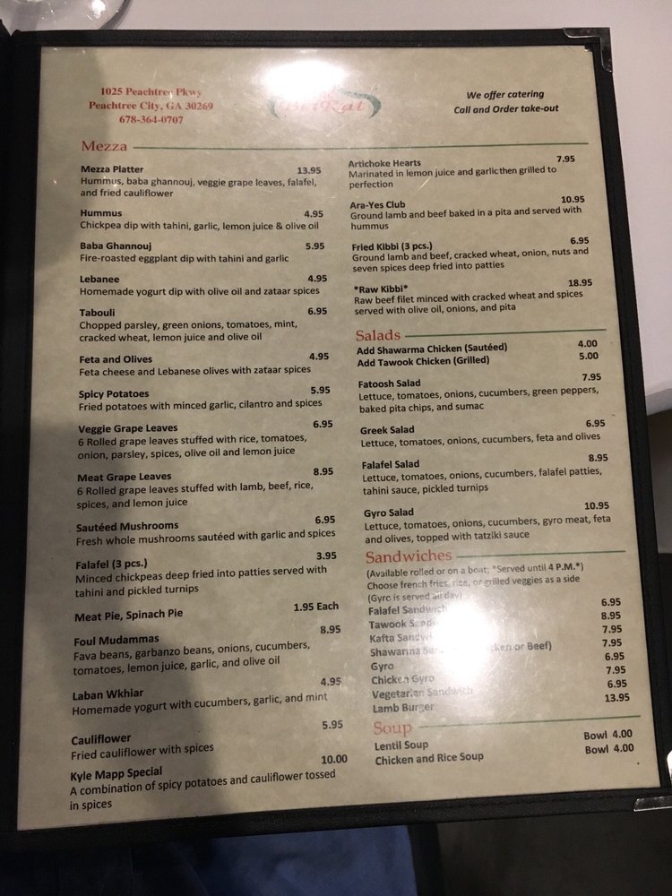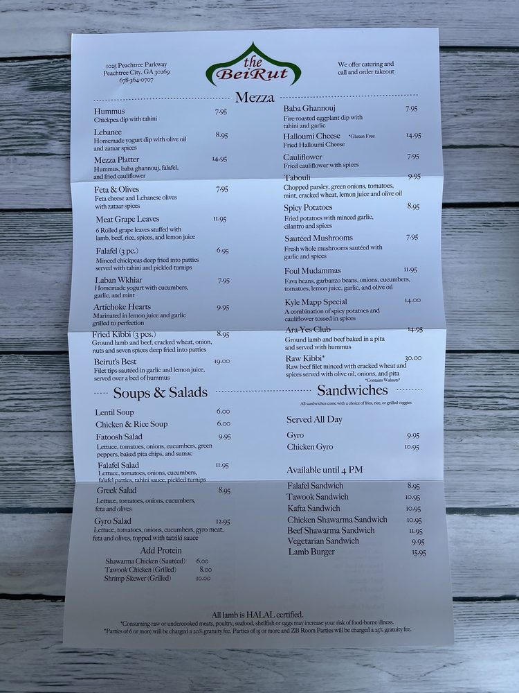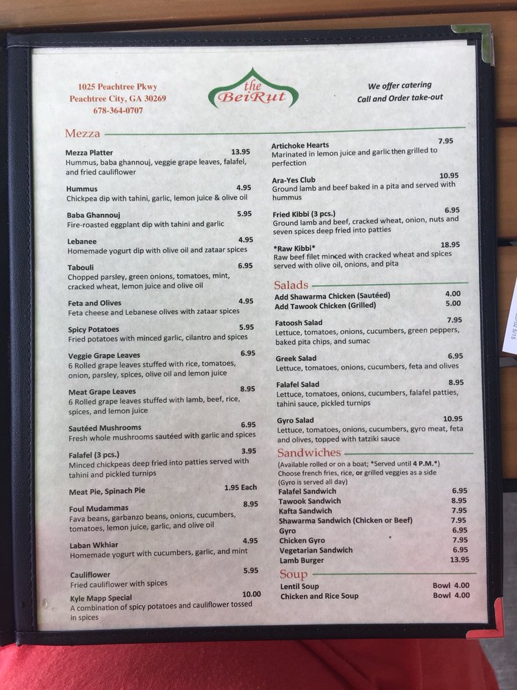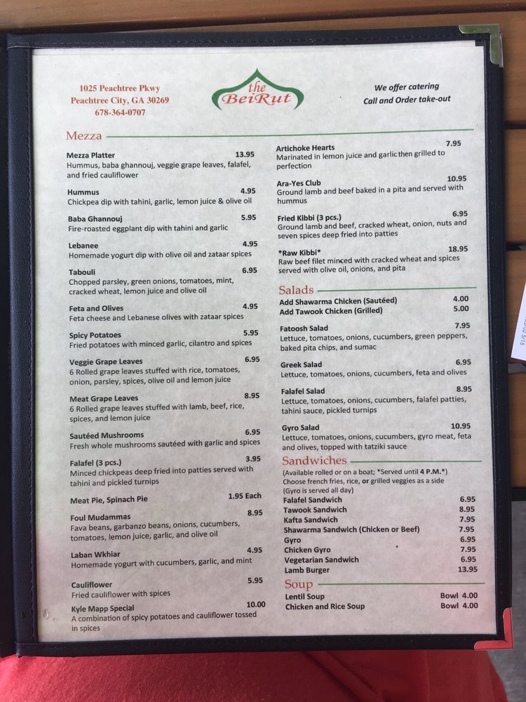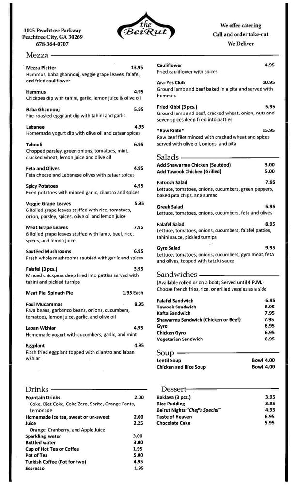 Introducing the menu at The Beirut, a restaurant located in Peachtree City, GA, known for its Mediterranean cuisine. Offering a variety of options including vegan dishes, the menu caters to all preferences. Customers rave about the flavors and quality of the food, with dishes like the lamb shank receiving high praise. The restaurant's ambiance is described as perfect, and the service is friendly and quick. While some customers mention the need for an update in the restaurant's decor, the overall experience at The Beirut is highly recommended. Whether you're looking for a casual meal or a special dining experience, The Beirut promises delicious food and exceptional service.